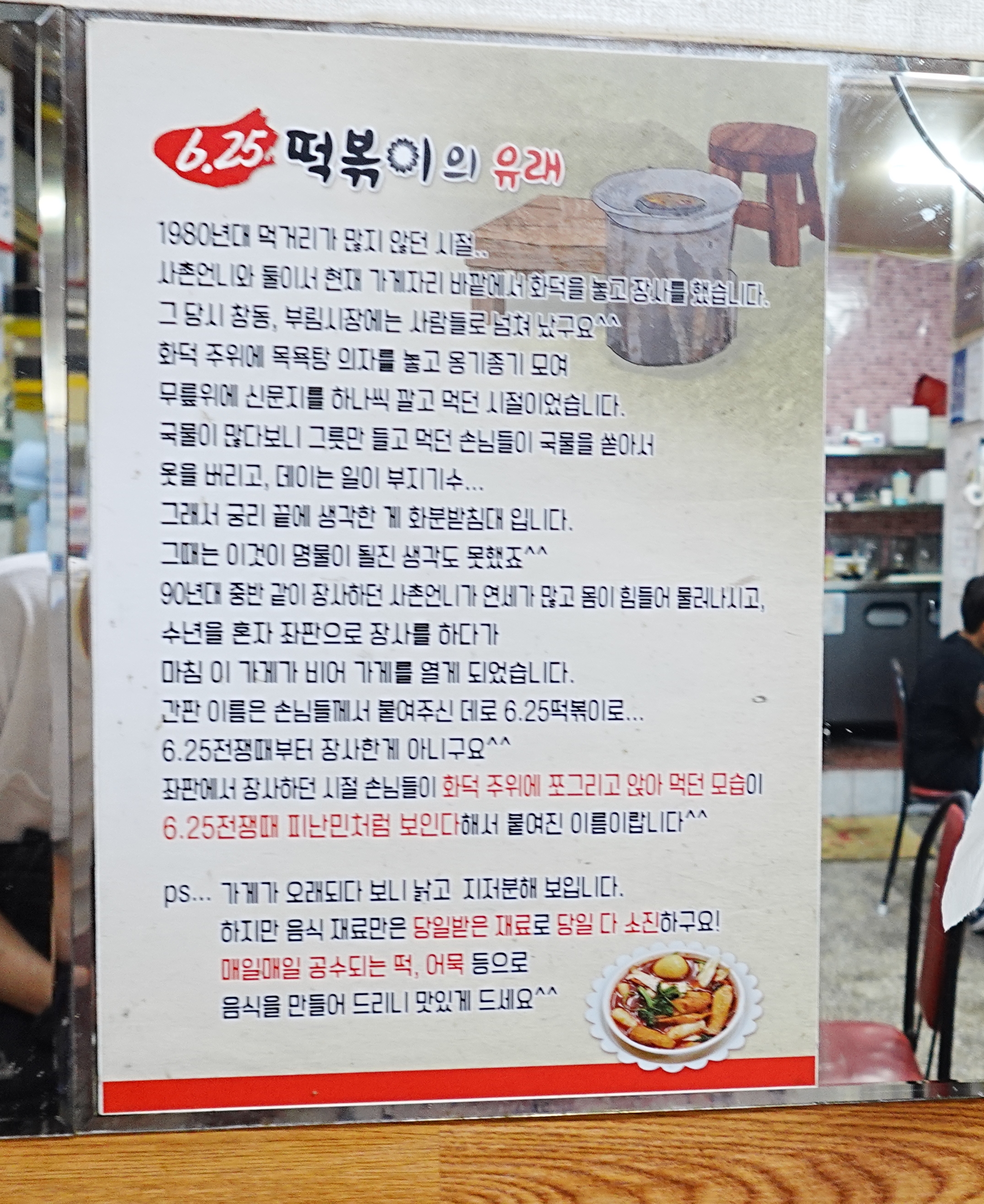 625떡볶이라는 이름은 한국전쟁 시절과는 무관하고, 80년대 창립 당시 피난민처럼 맛있게 먹는 모습에서 유래했다고 해요.