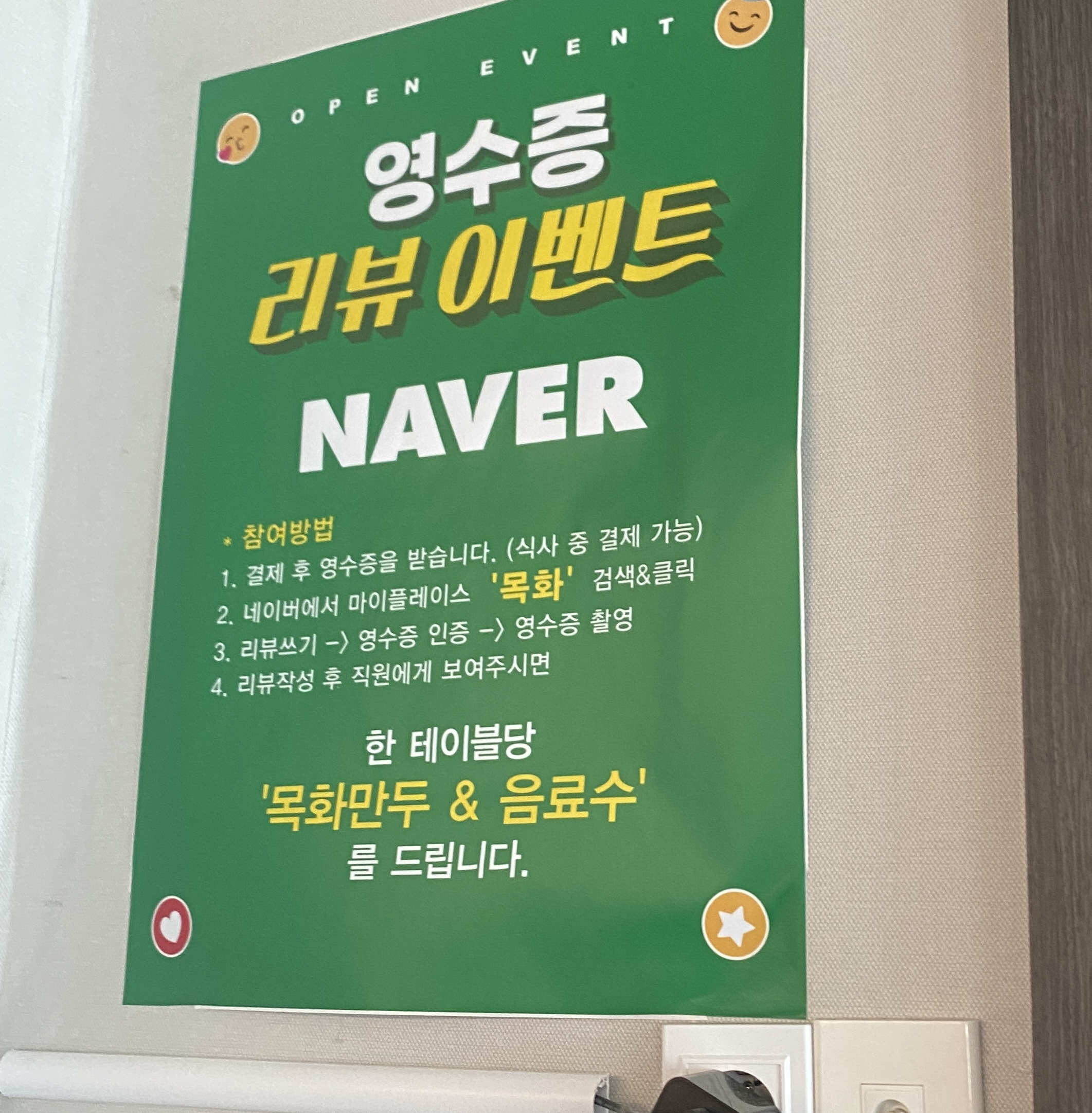 매장을 둘러보다 보니 네이버 영수증 리뷰 이벤트를 진행하고 있었는데, 만두나 음료수를 증정한다고 쓰여있었어요. 아쉽게도 식사를 마치고 결제까지 다 한 후에야 이 사실을 알게 되어 참여하지 못했습니다. 다음번에 방문하게 되면 꼭 참여해서 혜택을 받아야겠어요!