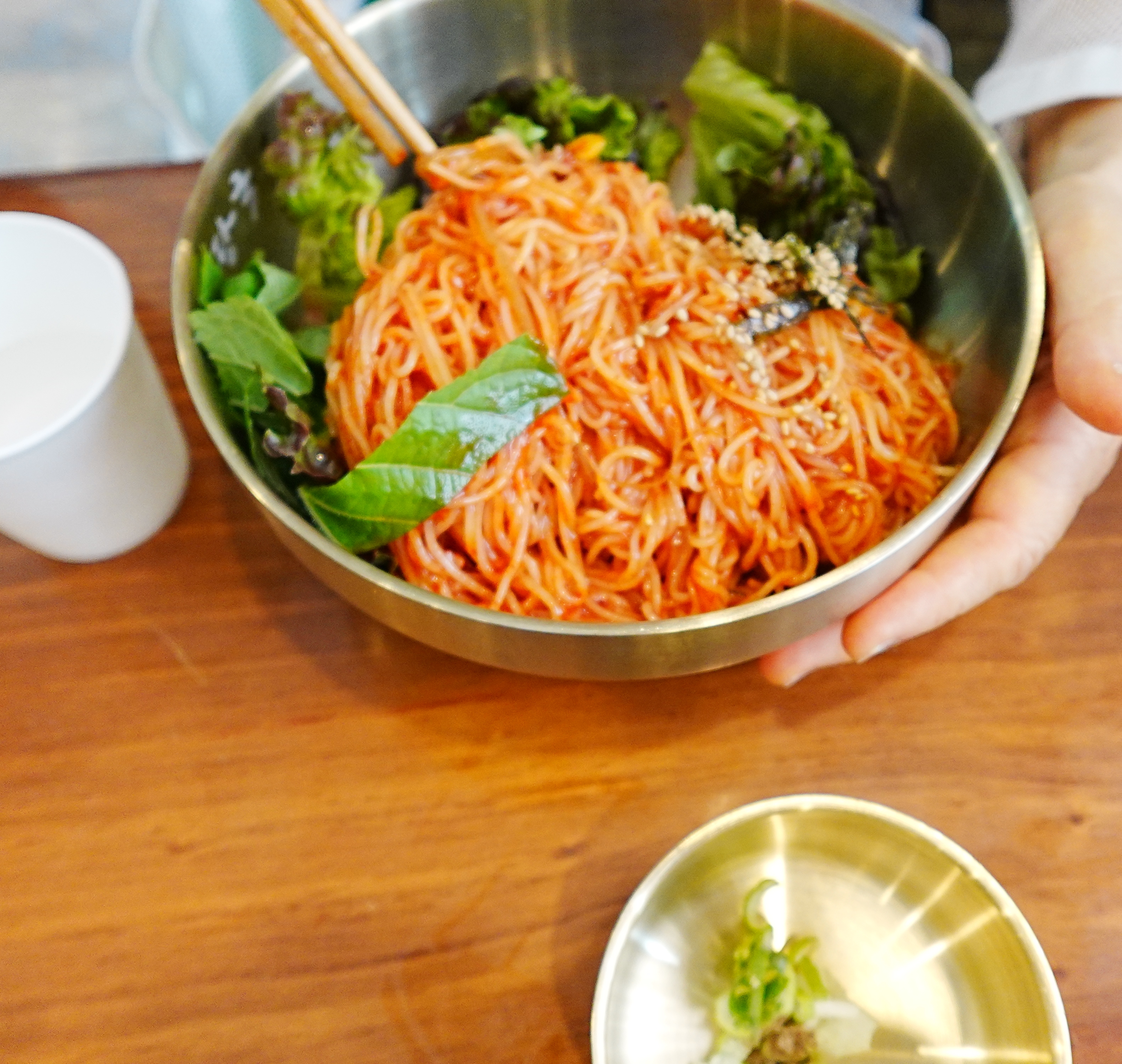 지인은 시원한 비빔국수를 선택했습니다. 곱배기로 주문해 서로 조금씩 나눠 먹었는데, 비빔국수 또한 고소한 참기름 향과 아삭한 야채들이 어우러져 정말 맛있었습니다. 새콤달콤한 양념이 입맛을 확 살려주는 맛이었어요.