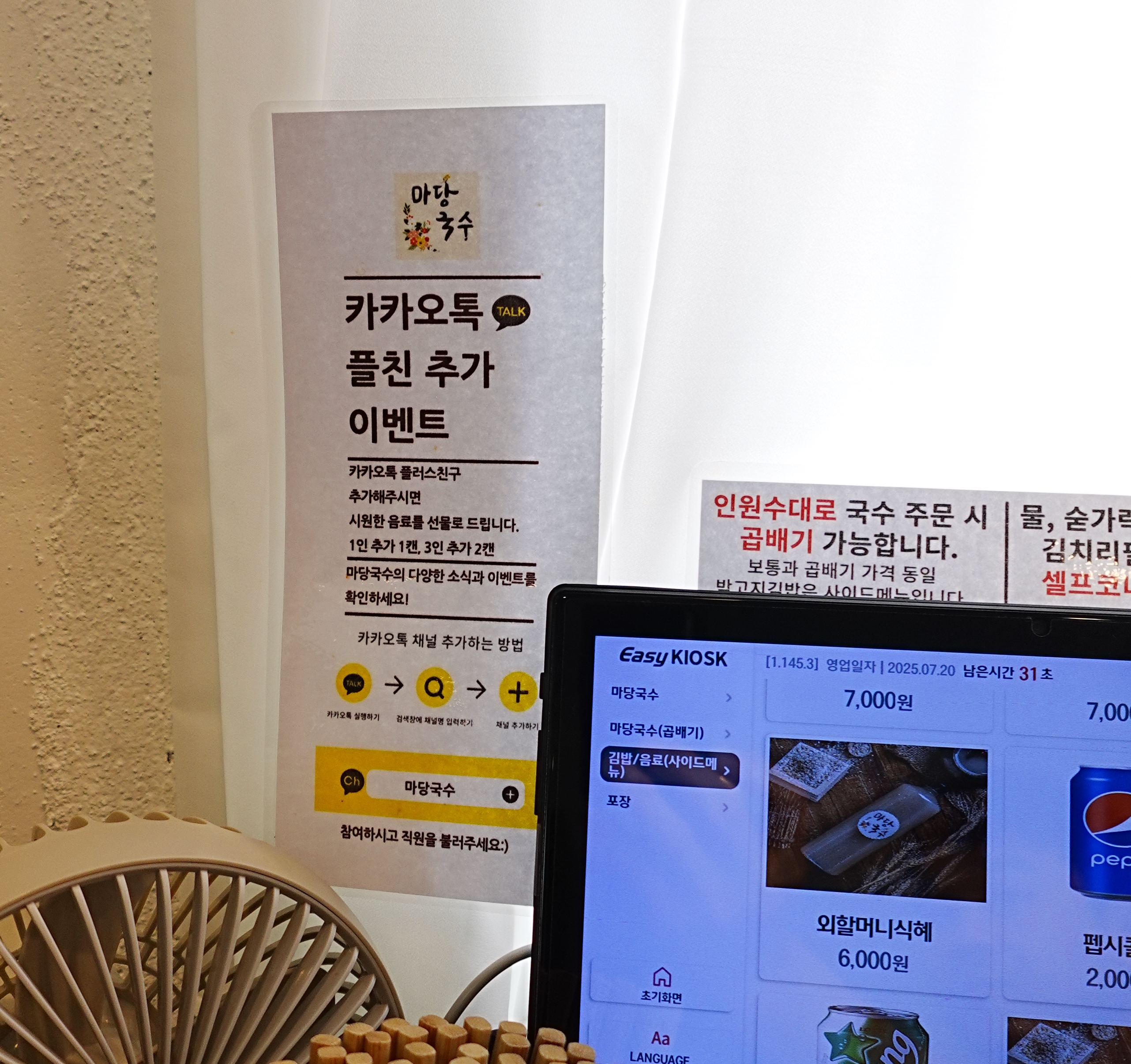 테이블마다 설치된 태블릿으로 편리하게 주문할 수 있었고, 카카오톡 채널 추가 시 음료수 1개를 무료로 제공하는 이벤트도 진행 중이라 사이다 한 캔을 득템했습니다.