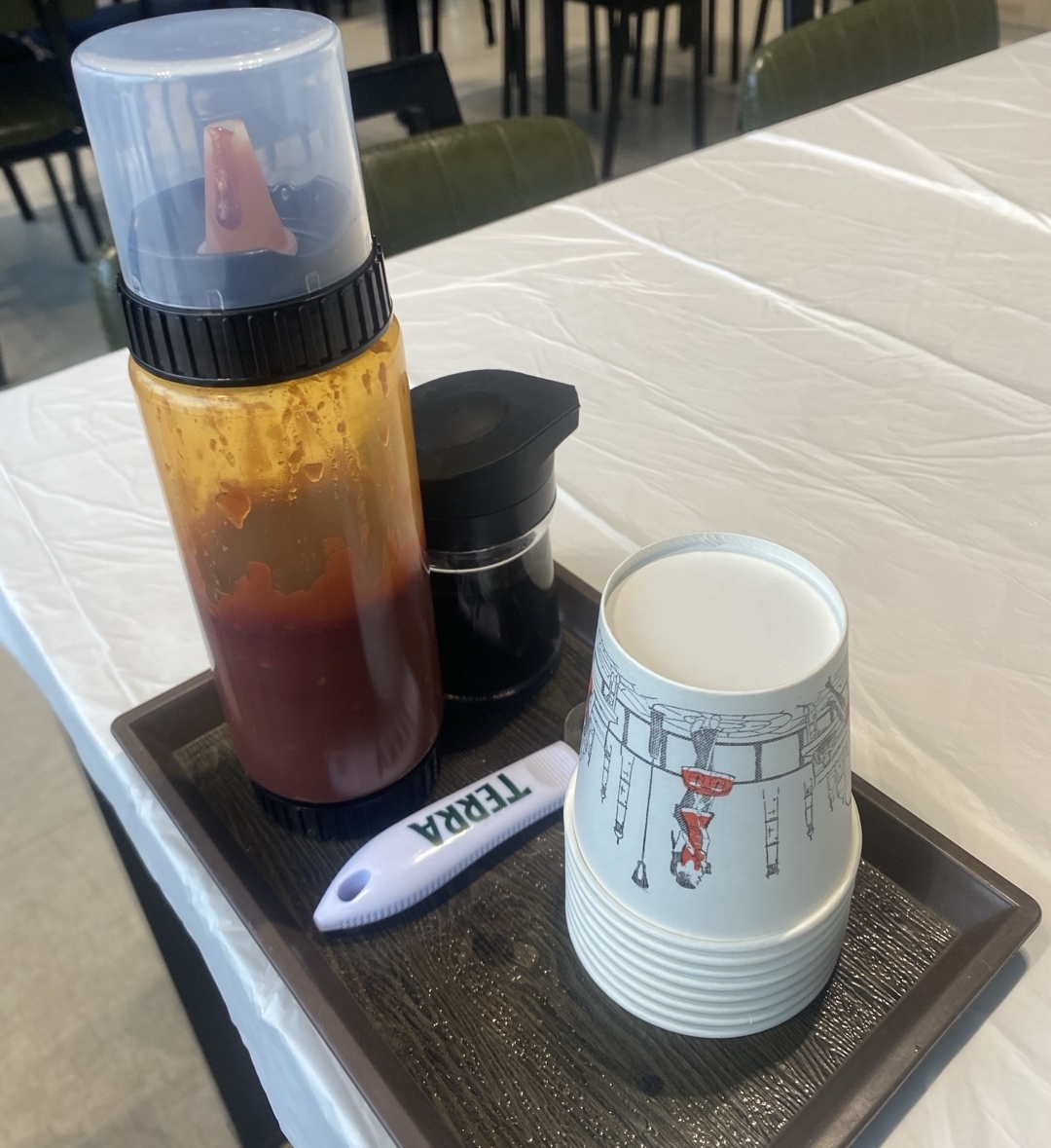 테이블 위에는 간장과 초장이 미리 세팅되어 있어 원하는 만큼 덜어 먹을 수 있었습니다.
