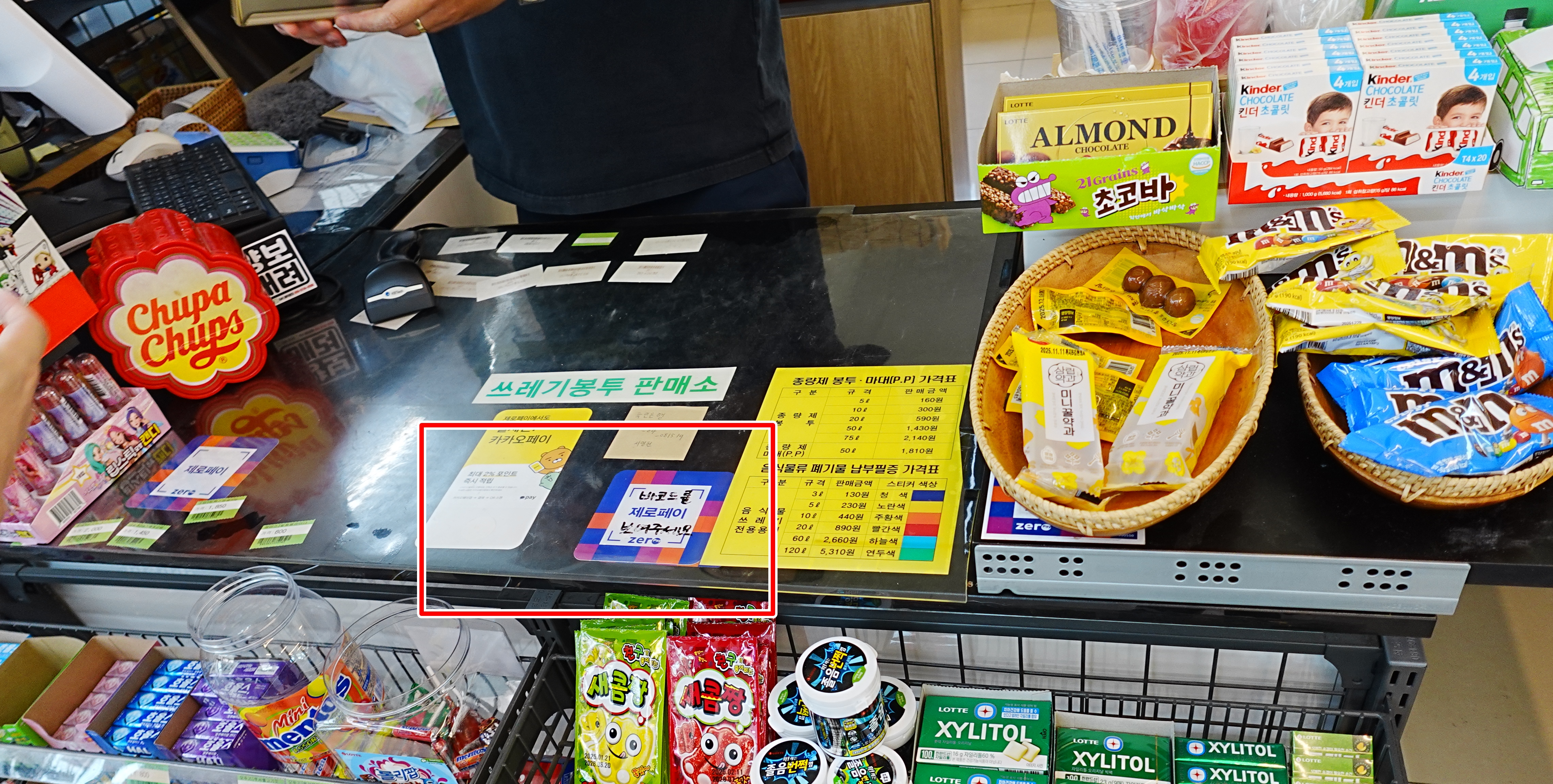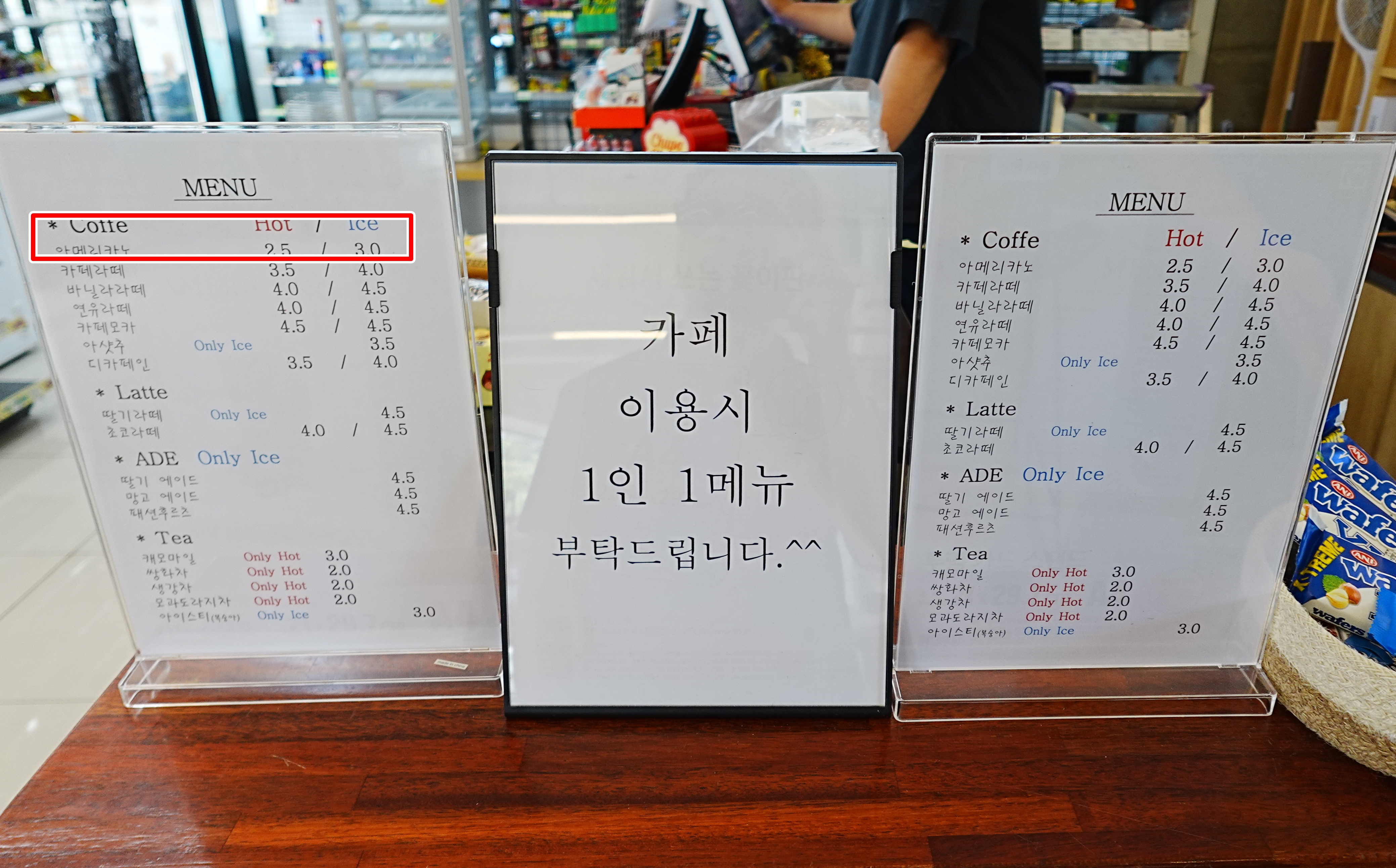 처음 입구에 들어서자마자 "여기가 카페가 맞나?"라는 생각이 들 정도로, 편의점 코너와 카페 코너가 자연스럽게 연결되어 있었습니다. 입간판에는 다양한 상품들이 진열되어 있었고, 간단한 생필품들까지 구매할 수 있어 신기했습니다.