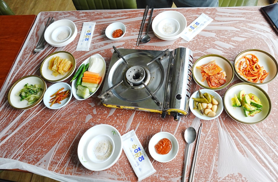 기본적으로 간단한 나물류의 밑반찬과 휴대용 가스버너가 제공됩니다.