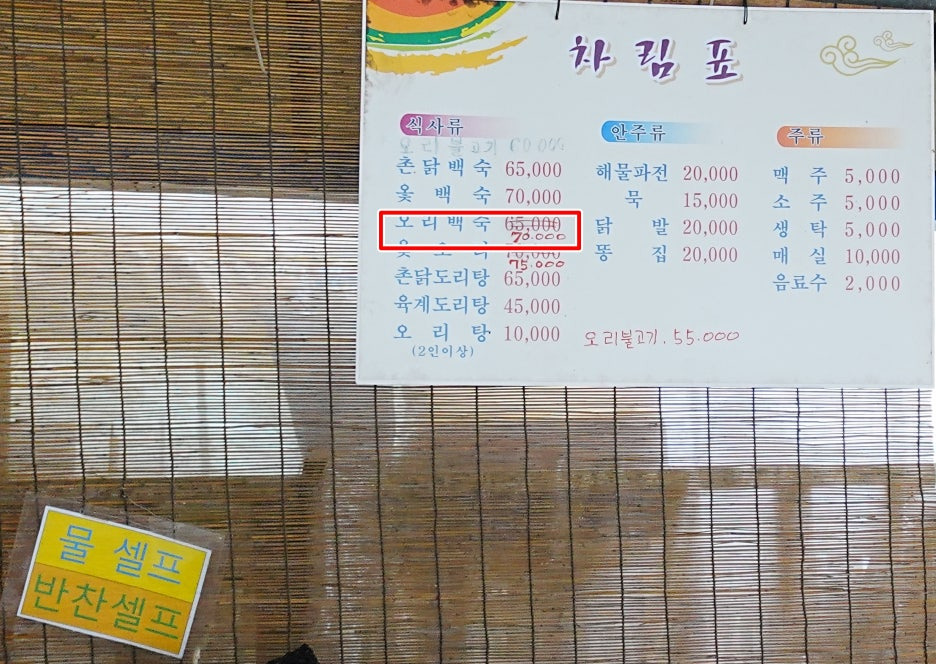 - 맛: 부드러운 살코기는 뼈에서 쏙 빠질 정도로 푹 익었으며, 구수한 육수는 그야말로 일품이었습니다. 특히 계곡을 바라보며 시원한 바람을 맞으며 먹는 오리백숙은 맛뿐만 아니라 분위기까지 더해져 최고의 조합이었습니다.